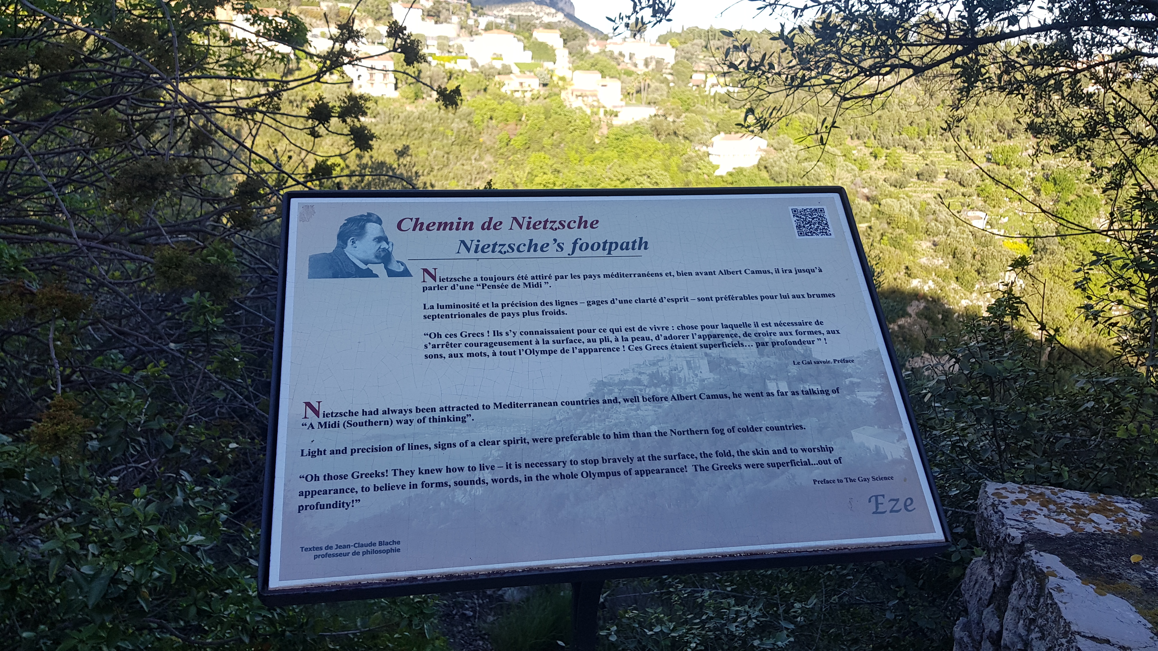 - ↑ La version philosophique : Montée depuis la gare d'Èze-sur-Mer. L'effort physique renforce l'expérience. Retour en bus.
